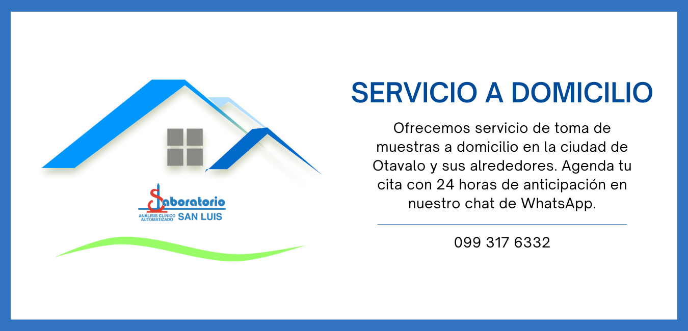 Ofrecemos servicio de toma de muestras a domicilio en la ciudad de Otavalo y sus alrededores. Agenda tu cita con 24 horas de anticipación en nuestro chat de WhatsApp.